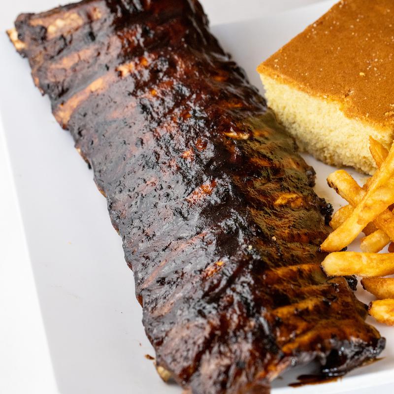 Choose a sauce for your Ribs or Chicken: Original BBQ Sauce, Pacific Rim (sweet chili & duck sauce, topped with scallions & peanuts) • Comes with choice of two sides: French Fries, Sweet Fries, Coleslaw, Rice, Mashed Potatoes, Baked Potato (Dinner Only), Corn Bread or Baked Beans or one side of Mac & Cheeses for an additional +$3.00 • Half Rack Baby Back ribs and mac and cheese $22 | Lunch only - No substitions