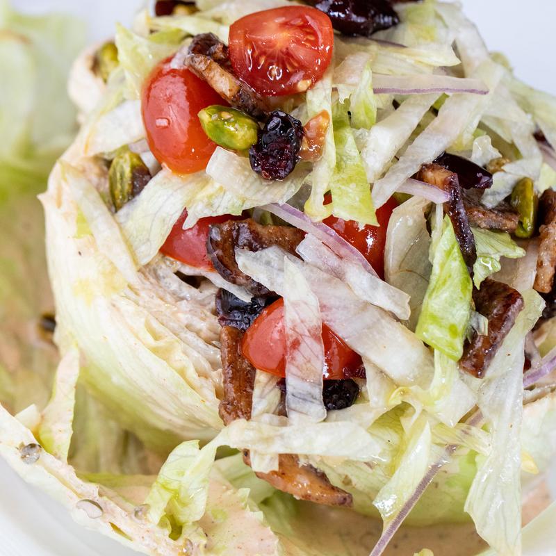 Iceberg lettuce, cucumbers, tomatoes, hearts of palm, artichoke hearts, avocado, hard boiled eggs, creamy balsamic vinaigrette.